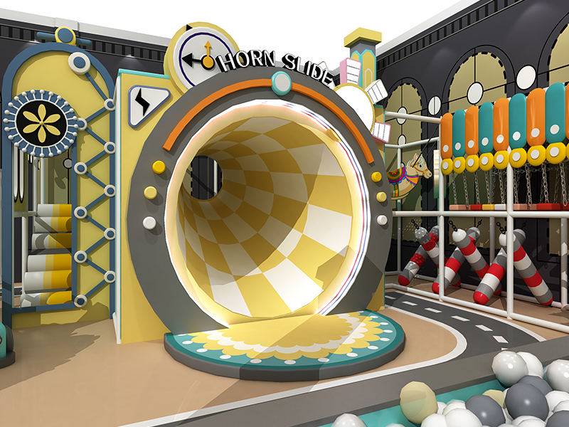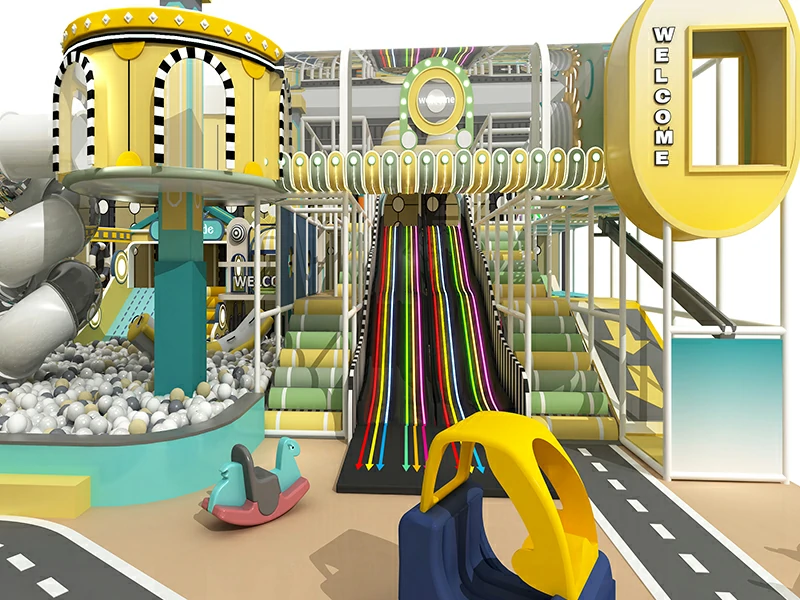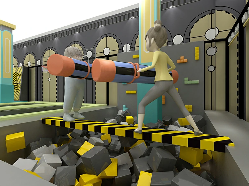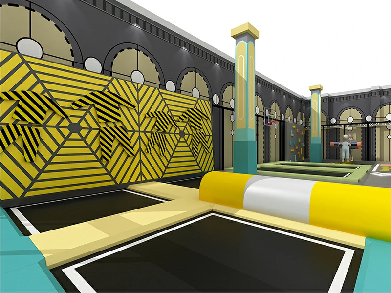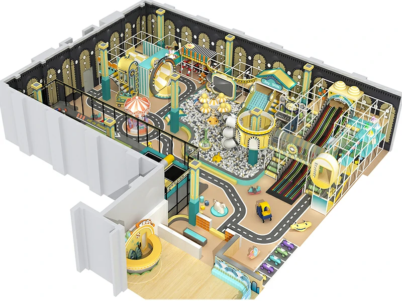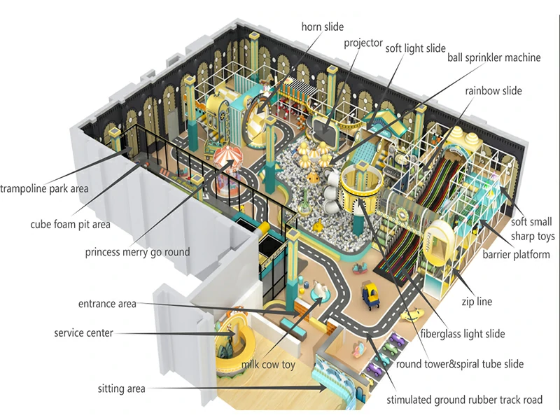 Game interaction area: The small rooms on the upper right and the area with a grid pattern are places for educational games or role-playing. There are also facilities such as carousels, colorful slides, and climbing nets.Rest part are trampoline park area with cube foam pit barriers.